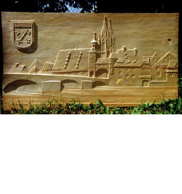 Steinerne Brücke und Dom. Lindenholz, ca. 60 x 100 cm