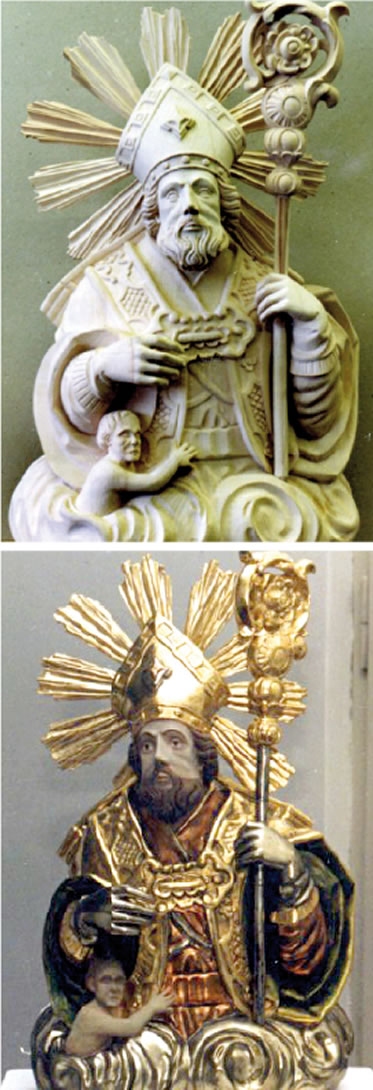 Original Figur gestohlen, neue Figur nach Foto nachgeschnitzt. Lindenholz, gefasst, vergoldet und versilbert, ca. 60 cm hoch